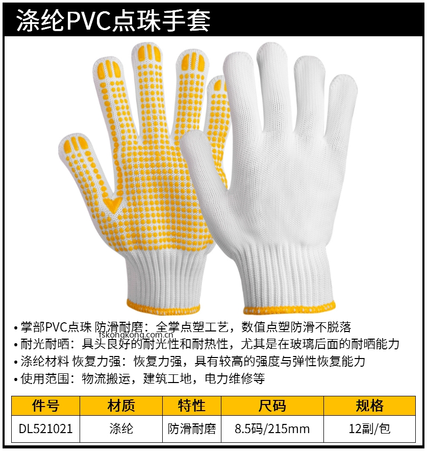 DELI/得力 DL521021 棉纱PVC点珠手套L码12副(黄)(包)