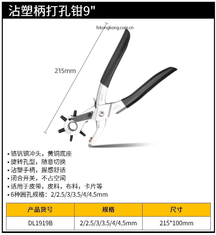 DELI/得力 DL1919B 沾塑柄打孔钳9寸6圆孔(黑)(把)