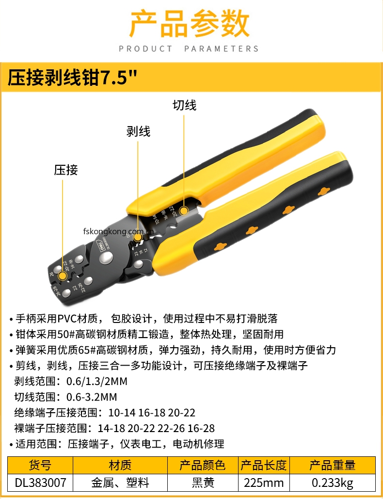 DELI/得力 DL383007 压接剥线钳7.5寸(黑)(把)