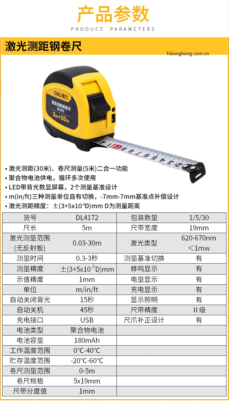 ①激光测量(30米)、卷尺测量(5米)二合一功能