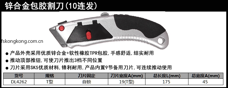 ③刀片采用SK5优质材料,锋利耐用,产品内置9节备用刀片,可连续推动使用